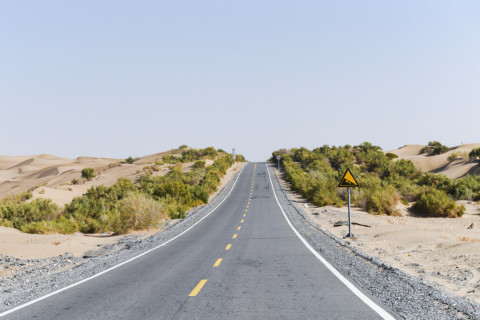 这条长达500公里的路,从南至北,风景不断变幻。靠近民丰一带,是绿洲与沙漠势均力敌的地方,仍可以看到草地,牛羊和骆驼在这里优闲地吃草,丝毫感觉不到已经来到了沙漠公路。随着逐渐深入沙漠腹地,植被渐渐褪去,仅留下道路两旁的固沙灌木丛,保护着这条要塞不被黄沙吞噬。