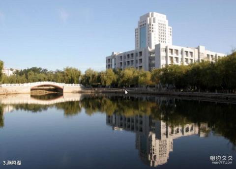 Introducción al lago Yanming: La superficie del agua es tan suave como un espejo y el cielo y el agua se mezclan. El puente de arco de piedra a lo lejos conecta con el agua. A ambos lados de la orilla hay sauces y hierba silvestre.