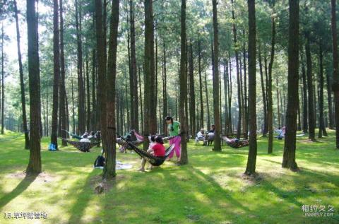 Introducción al camping con césped: Miles de pinos macizos altos y rectos en el jardín se funden en un vasto bosque, con una suave brisa. Debajo del bosque de pinos se encuentra un relieve kárstico único, con colinas escarpadas y rocas extrañas. El bosque, las rocas extrañas, las flores y la pradera se complementan.