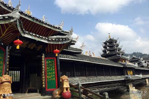 Introducción al Puente Puxiu: Para llegar a Dong Village, primero debes cruzar un puente de viento y lluvia llamado Puente Puxiu. El puente tiene 57,7 metros de largo y 4,2 metros de ancho. Tiene 21 corredores. pabellones del puente en la cabecera del puente y en el centro hay puertas de puente y crestas de techo en ambos extremos, y hay esculturas de arcilla de dragones, fénix, gallinas, etc. en los aleros y las esquinas.