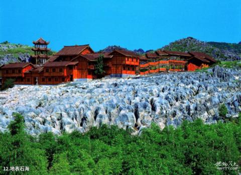 Introducción al mar de piedras de superficie: El mar de piedras de superficie en la zona turística del municipio de Shihaidong es la maravilla kárstica más grande de China. El mar de piedras se extiende por más de 20 millas de este a oeste y ocho millas de norte a oeste. Al sur, con diferentes picos y rocas extrañas compitiendo por la belleza, las vides se entrelazan, las montañas y los ríos son armoniosos y el paisaje es una mezcla perfecta.