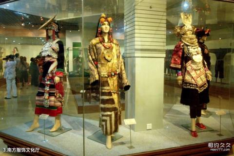 남부복식문화관 소개: 이 전시관에는 Tibetan, Memba, Lhoba, Yi, Hani, Lahu, Naxi, Baidai, Lisu, Nu, Dulong, Wa, Deang, Brown, Jino, Miao, Traditional이 전시되어 있습니다. Buyi, Dong, Shui, Zhuang, Yao, Tujia, Li, She, Gaoshan 및 기타 소수 민족의 의류, 보석, 신발, 브로케이드 및 자수 공예품.
