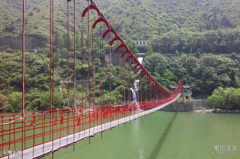 Lover's Bridge 소개: Lover's Bridge는 2006년 2월에 건설되었으며 Shimen Dam 아래 2km 떨어진 Baohe 강의 양쪽에 걸쳐 있습니다. 다리 길이는 160m, 폭은 0.8m로 산시성 남부 최초의 경간 현수교입니다. 애인의 다리 양쪽 다리 기단에는 원양정이 대칭으로 세워져 있으며, 원양정은 높이 6m, 폭 5.8m, 길이 12.5m의 단일 처마가 있는 2개의 정사각형 정자로 구성되어 있습니다. 누각의 사방에는 벤치가 있고 기둥은 밝은 빨간색 페인트로 칠해져 있으며 처마는 금색 선이 있는 소주 스타일의 그림으로 장식되어 있으며 지붕은 회색 도자기 타일로 포장되어 있습니다. 다리 본체는 전체적으로 주황색-빨간색이며 우아한 호 모양을 하고 있으며, 다리 양쪽에는 녹색 산이 서 있고, 다리 아래에는 푸른 물이 흐르며 양쪽을 연결하는 빛나는 무지개처럼 보입니다. 바오 밸리.