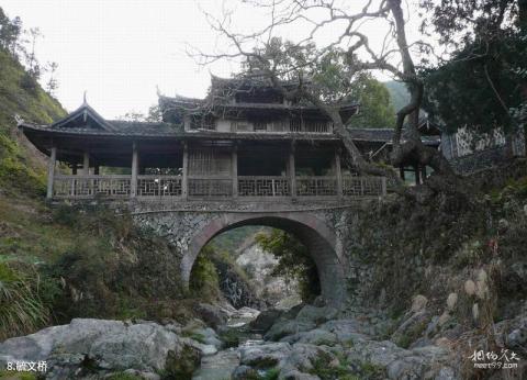Introduction to Yuwen Bridge: Yuwen Bridge is a stone arch wooden covered bridge. The stone arch is built of bluestone and is in the shape of a half-moon, spanning two mountains. There is a gallery house built on the stone arch, with a three-story pavilion style. The first floor is for pedestrians to cross the bridge, the second floor is like a small attic, and the third floor is square with a gourd-shaped spire above the middle of the roof ridge. Different from other covered bridges, Yuwen Bridge is not sealed with wooden boards on both sides, but with finely crafted lattice wood carvings. The inside and outside of the bridge are transparent and visible, integrating with the surrounding green hills, ancient trees, mountain roads, and streams.