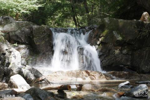 Introduction to hanging kettle: There is a waterfall behind the boulder next to the wooden ropeway bridge. The drop is several meters, with a curtain of flying water and strands of water pouring down, fine and continuous.
