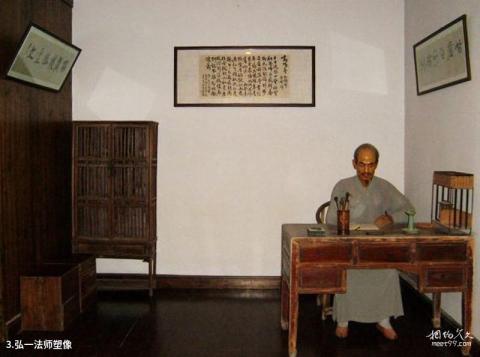 Introduction to the statue of Master Hongyi: In the memorial hall, there is also a statue of Master Hongyi sitting at the table and writing. Also on display are calligraphy works hanging on the wall, showing Master Hongyi’s artistic achievements and Buddhism. Achievements.