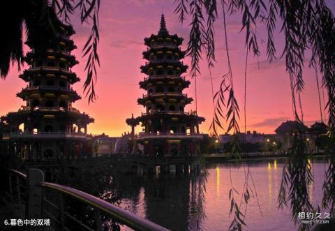Introduction to the Twin Towers in Twilight: As the sun sets in the west, colorful clouds are flying all over the sky. The purple haze gives the Dragon and Tiger Twin Towers in the twilight a mysterious color.