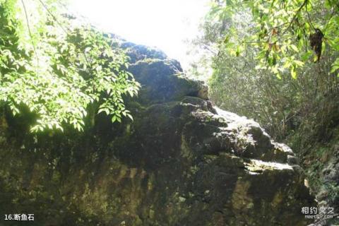Introduction to the broken fish stone: The broken fish stone is like a huge fish, with its head and tail separated, lying on the stream. Legend has it that this fish is a fish monster in the deep pool. It has been cultivated into a spirit and often disturbs streams and mountains and causes harm to places. Master Zhang Tianshi was refining the golden seal sword here. When the sword was made, the fish was making trouble here, so the Heavenly Master tried the sword and cut the fish monster into two pieces with one sword. The fish tail was thrown far away and separated from the fish body forever.