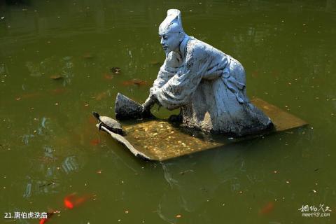 Introduction to Tang Bohu's Fan Washing: The pool on the west side is used for Tang Yin's fan washing. In ancient times, fans were mostly silk fans. When painting, the paintings can be washed and repainted while the ink is still wet. The talented Tang Bohu often washed out his works and strived for perfection.
