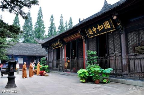 Introduction to the Main Hall: The Main Hall is a single-eaves Xieshan-style building. It was first built in the thirty-sixth year of Kangxi (1697 AD), rebuilt in the sixth year of Qianlong (1741 AD), and completed in the 23rd year of Jiaqing (1818 AD). ) expansion. A plaque with the words "Namo Sakyamuni Buddha" hangs in front of the main hall, indicating that people take refuge in the Lord Buddha, Sakyamuni Buddha. There is a word "福" on the door, which has been touched like gold by people. Because people firmly believe that if they kneel and worship in front of the Lord Buddha, they will definitely receive the blessings of the Lord Buddha. There is a bronze statue of Sakyamuni Buddha in the hall, which is 2.64 meters high and was cast in the ninth year of Daoguang (1829). Sakyamuni is flanked by statues of Kasyapa and Ananda, each 2.14 meters high. In front of the Sakyamuni statue is a bronze statue of Guanyin with thirty-two arms, 1.32 meters high. The hall is simple and clean, and is a place where eminent monks in the courtyard conduct Buddhist teachings.