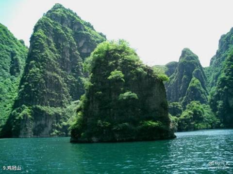Introduction to Jiguan Mountain: Also known as Duxiu Peak and Fengguan Island. Surrounded by water on three sides, one peak is alone. It is about 70 meters from the top of the mountain to the water. From the front, it looks like a lying rooster. It is the iconic landscape of Longqing Gorge.