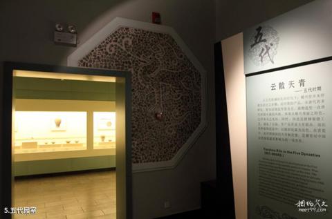 Introduction to the Five Dynasties Exhibition Room: The Yaozhou kiln of the Five Dynasties mainly fired celadon. The process technology has been greatly improved, and the products have further developed towards high-end and fine products. The shapes of the vessels are mostly imitations of gold and silver, exquisite and beautiful. The glaze color is warm and elegant, and the texture is excellent. The main decorative techniques are picking and scratching. In addition, the unearthed specimens with the word "official" in the ruins area prove that the Yaozhou Kiln once fired porcelain for the palace or the government. His pioneering foot-wrapped glaze nail firing technique and azure glazed porcelain had a profound impact on the firing of official kiln porcelain in later generations.