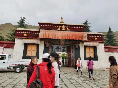 寺院就在318国道旁边,交通非常方便。真不愧是度母加持的寺院,不大的庭院里,各种鲜花争奇斗艳,娇艳欲滴。我和一位师兄瞬间就迷失在这些鲜花中了,两个人忙着拍照片,不留意间,大部队已经不见了。我们赶紧追上去,原来大家已经进了大殿,在排着队等待度母的加持呢!寺院的师父手中持着度母像,一一给大家加持。大殿里,僧人们一字排开正在念经,声音优美动听,抑扬顿挫,师兄们赶紧各自供养。走出寺院大殿,左手边有一个古老的转经轮,上面悬挂着一枚铜铃,转经轮每转一圈,铜铃就会发出一声清脆的声音。这是我们在其他地方未曾见过的。转经轮的旁边,是一根同样古老的金刚幢,用铁栅栏护着,据说这些也是阿底峡尊者所留下的珍贵法宝。