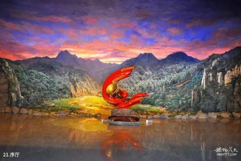 序厅介绍:序厅展示的是南方三年游击战争的山水画卷,采取油画和山体实景制作的方式,以达到逼真效果,序厅正中军号圆雕,寓意吹响南方八省红军游击队响应党的号召下山集结改编的集结号和新四军奔赴大江南北杀敌抗战的冲锋号,营造了与“新四军从这里走来”主题相一致的氛围,让观众走进展厅,思绪就与这种纪念氛围同步。