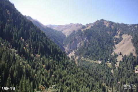 密林沟谷介绍:景区东部三面环山,东南两面崇山之上,布满云杉,苍郁葱葱。沿南面密布松林中的崎岖小道可达山顶,顶部一片起伏绵延的碧绿草地,间有云松散布,有百米瀑布从崖头飞流直下,直泻沟底深潭,浪花泛起、白雾弥漫、雷霆万钧;沟畔林下乱石突兀,水流急湍,珠玉飞溅。山顶瀑布源头,凉风习习,脚下景致尽收眼底。