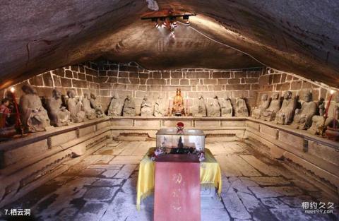 栖云洞介绍:栖云洞为天然石洞,高约3米,口窄内宽,光线幽微,有许多不同朝代的题刻,为中国书法艺术的宝库。洞内有“澄心”古井,泉水特别清甜可口,若用来煎泡“七境绿茶”,浓香四溢,沁人脾肺。洞里更难能可贵的是18罗汉青石像,高矮大小参差不齐,但线条造型皆古朴粗犷。供奉罗汉的佛台上有“住山比丘正心,谨募檀那壹拾玖位,各人舍钱七贯,制造观世音菩萨乙尊,并住世罗汉台拾捌位,安奉供养。岁戊申淳祐捌年玖月拾贰日,造石匠陈曾缘”等题刻。宋淳祐八年为公元1248年,至今750年。据说唐之前只有16尊罗汉,宋代才增加“庆友尊者”和“宾头庐尊者”。