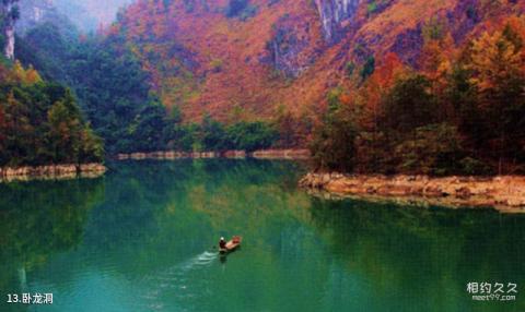 卧龙洞介绍:卧龙洞在龙塘湖左侧,洞内地下暗河与打贵河相连,需乘船方能到达,洞高30~80米,宽10~20米,洞长500余米,内河水深7~15米,洞内钟乳石造型别致,千姿百态,洞的入口处由于岩溶风化形成一个巨大的天窗,使得洞口犹如一个天生桥,而穿过以后又有一个新的洞口,故当地人将此洞称为双门洞。