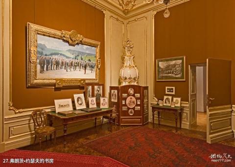 弗朗茨•约瑟夫的书房介绍:弗朗茨•约瑟夫是一个非常有责任感的皇帝,自18岁登基起每天都要处理庞大的工作计划,他从早上5点便已开始工作,房间内的写字桌既是他的办公桌,也是他享用早餐的地方,一生勤勉,自称国家的第一公务员。书房四周的墙壁多是家庭成员的油画和照片,还有他的孩子和孙子送给他的礼物,巨幅油画之一是弗朗茨•约瑟夫33岁的时候画的,另外一幅是他的皇后伊丽莎白,是一个以小名茜茜成为传奇人物的皇后。