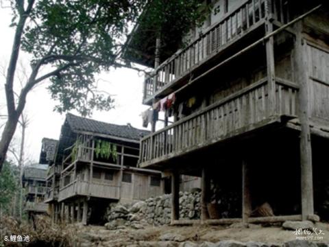 鲤鱼池介绍:鲤鱼池位于土坨峡首的乌江西岸,属沿河县思渠镇,山寨土家民族风情浓郁,民风纯厚。寨中的吊脚楼是土家吊脚楼的典型代表,其窗花运用了浮雕、镂空雕等多种雕刻工艺,雕刻手法细腻,内涵丰富多彩,有的象征地位、有的祈求吉祥、有的表现农耕、有的反映生活、有的教育子孙、有的记录风情,飞禽走兽、花鸟虫鱼、歌舞竞技、神话传说,栩栩如生,蓄意深刻。